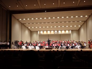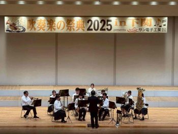 9月20日土曜日の13時より、下関市民会館大ホールにて「吹奏楽の祭典2025 in 下関」が行われました。下関商業高校、早鞆高校、長府高校、下関工科高校、川中中学校の5校の合同の演奏会で、各校それぞれの演奏の後、合同で「ブラボーブラス」、」「さくらのうた」、「アフリカンシンフォニー」の3曲を演奏しました。各校の特色を生かした演奏に加え、130名での合同演奏は、迫力のあるサウンドをホールに響かせ、大変盛り上がりました。