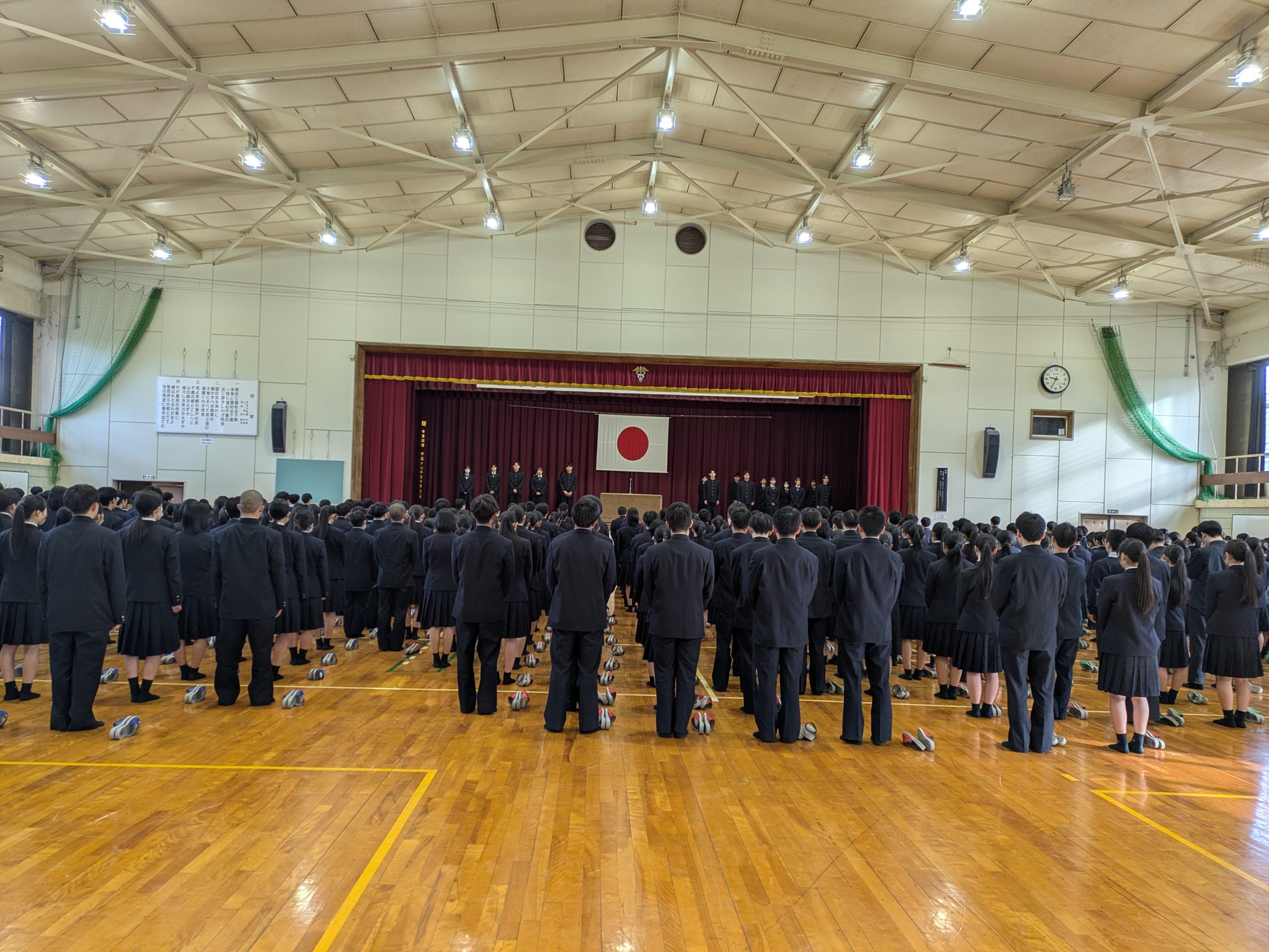 令和7年度生徒会の10名は任期を終え、本日退任いたしました。交通安全運動や野球応援、下商祭、生徒総会と、あらゆる場面で頑張ってくれた先輩の背中を見て、新たな10名が令和8年度生徒会として役割を引き継ぎました。一人一人に認証書を手渡された校長先生より「学校をより良くしていくのは教員だけではなく、実際に学校に通っている生徒の皆さん自身でもあります。その生徒の代表として選ばれた生徒会役員として、頑張ってください。」と挨拶をいただきました。今後は、生徒会役員という自覚と責任をもって、活動に積極的に励んでもらいたいと思います。
